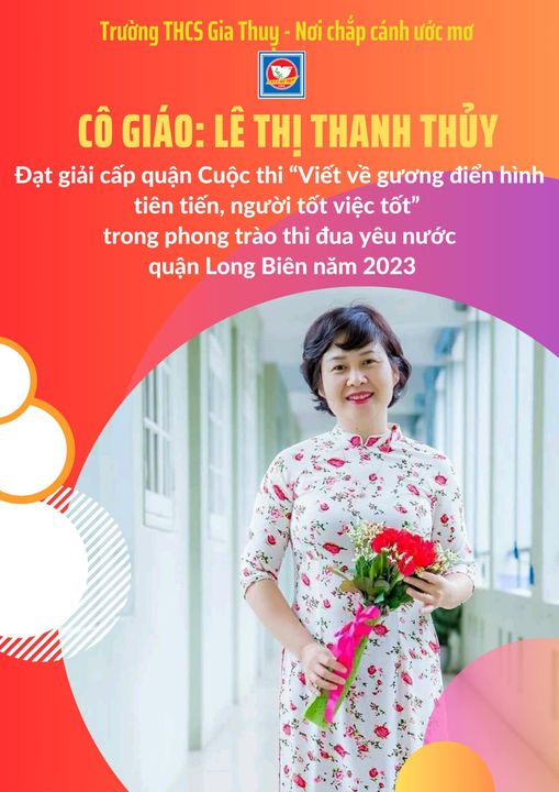 Cô giáo Lê Thị Thanh Thuỷ được nhận Giấy khen của UBND quận Long Biên theo Quyết định 3689/QĐ-UBND ngày 29/8/2023 về việc khen thưởng tập thể, cá nhân tham gia Cuộc thi “Viết về gương điển hình tiên tiến, người tốt việc tốt” trong phong trào thi đua yêu nước quận Long Biên năm 2023.