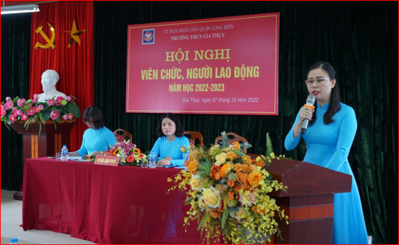 Thực hiện Hướng dẫn số 07/HD-LĐLĐ của Liên đoàn Lao động quận Long Biên về quy trình tổ chức Hội nghị viên chức, người lao động khối trường học - năm học 2022 -2023; Được sự đồng ý của Liên đoàn Lao động quận và Chi bộ trường THCS Gia Thụy, sáng ngày 07 tháng 10 năm 2022, trường THCS Gia Thụy long trọng tổ chức:
