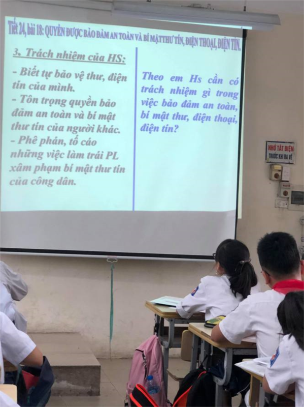 Trước những ý kiến, quan điểm cá nhân, cô giáo đã giúp học sinh có những đánh giá, nhận xét chuẩn xác nhất để từ đó các em nhận thức được quyền được đảm bảo an toàn, bí mật thư tín, điện thoại và điện tín là một trong những quyền cơ bản của công dân, đã được quy định trong Điều 21, Hiến pháp 2013 của nhà nước. Trong tiết học, bằng những hình ảnh sinh động, phong phú, đặc biệt là những tình huống có trong thực tế, các em học sinh đã thẳng thắn bày tỏ quan điểm của bản thân về quyền được pháp luật bảo về, tôn trọng đối với những thông tin cá nhân. Qua đó, HS biết tôn trọng quyền bảo đảm bí mật thư tín, điện tín của người khác đồng thời biết lên án, phê phán những hành vi, việc làm trái pháp luật: xem trộm thư từ, đọc trộm nhật kí, đọc trộm điện thoại…Tiết học với định hướng phát huy các năng lực học tập bộ môn của HS đã được cô giáo thực hiện một cách hiệu quả.Tuy nhiên, tiết học cũng cần lưu ý cách thức tổ chức các hoạt động để tất cả học sinh trong lớp cùng hưởng ứng tham gia, cô giáo cũng cần giới thiệu kĩ hơn, giúp học sinh hiểu rõ và phân biệt các khái niệm thư tín, điện tín. Phương pháp dạy học sẽ được áp dụng rộng rãi trong dạy học bộ môn GDCD khối 6 trong Nhà trường.