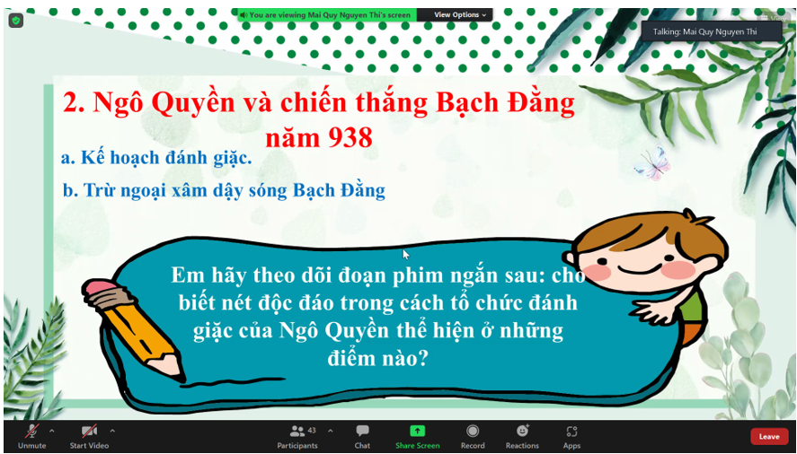 Để tiết học trở nên không khô khan, cô còn sử dụng video lịch sử với những hình ảnh trực quan sinh động, âm thanh lồng ghép giàu cảm xúc nên đã cuốn hút các con nhớ bài. Bởi vậy, dù là tiết học trực tuyến nhưng học sinh rất sôi nổi, tích cực và tương tác rất tốt với giáo viên.