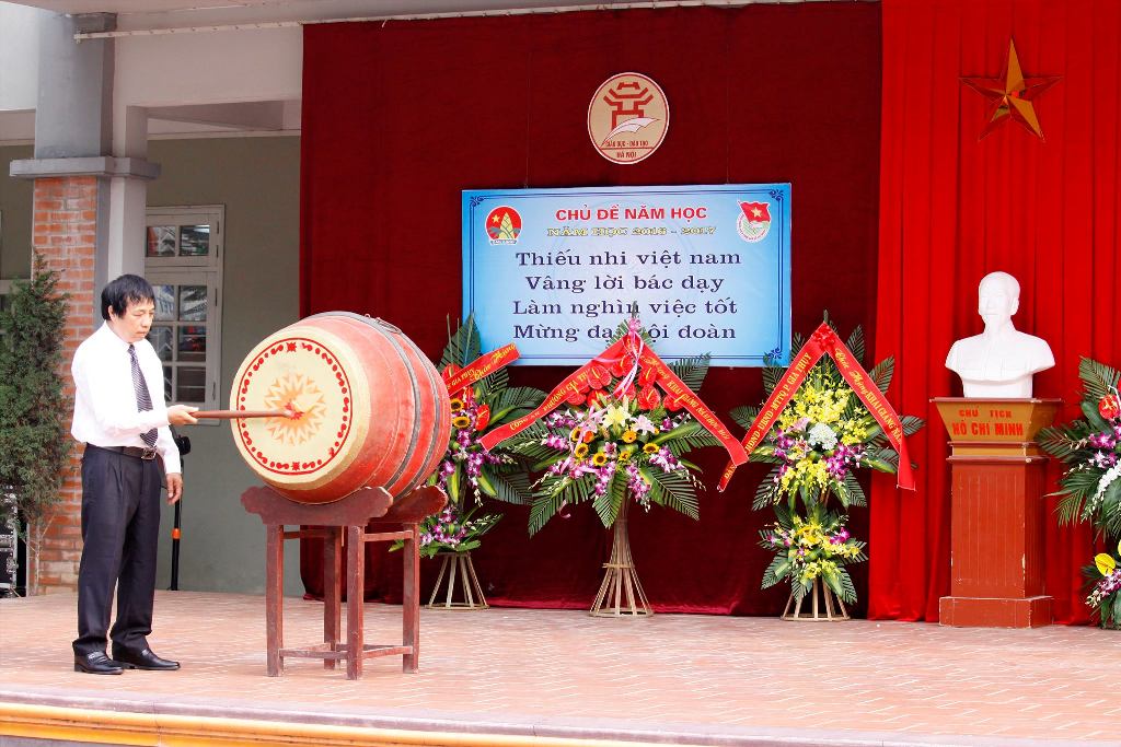 Hòa trong không khí trang nghiêm của buổi lễ, đồng chí hiệu trưởng đánh trống khai giảng năm học mới 2016 -2017.
